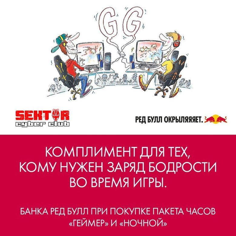 При покупке пакетов "Геймер" или "Ночь" вы получаете бесплатный РедБул от наших любимых партнеров.