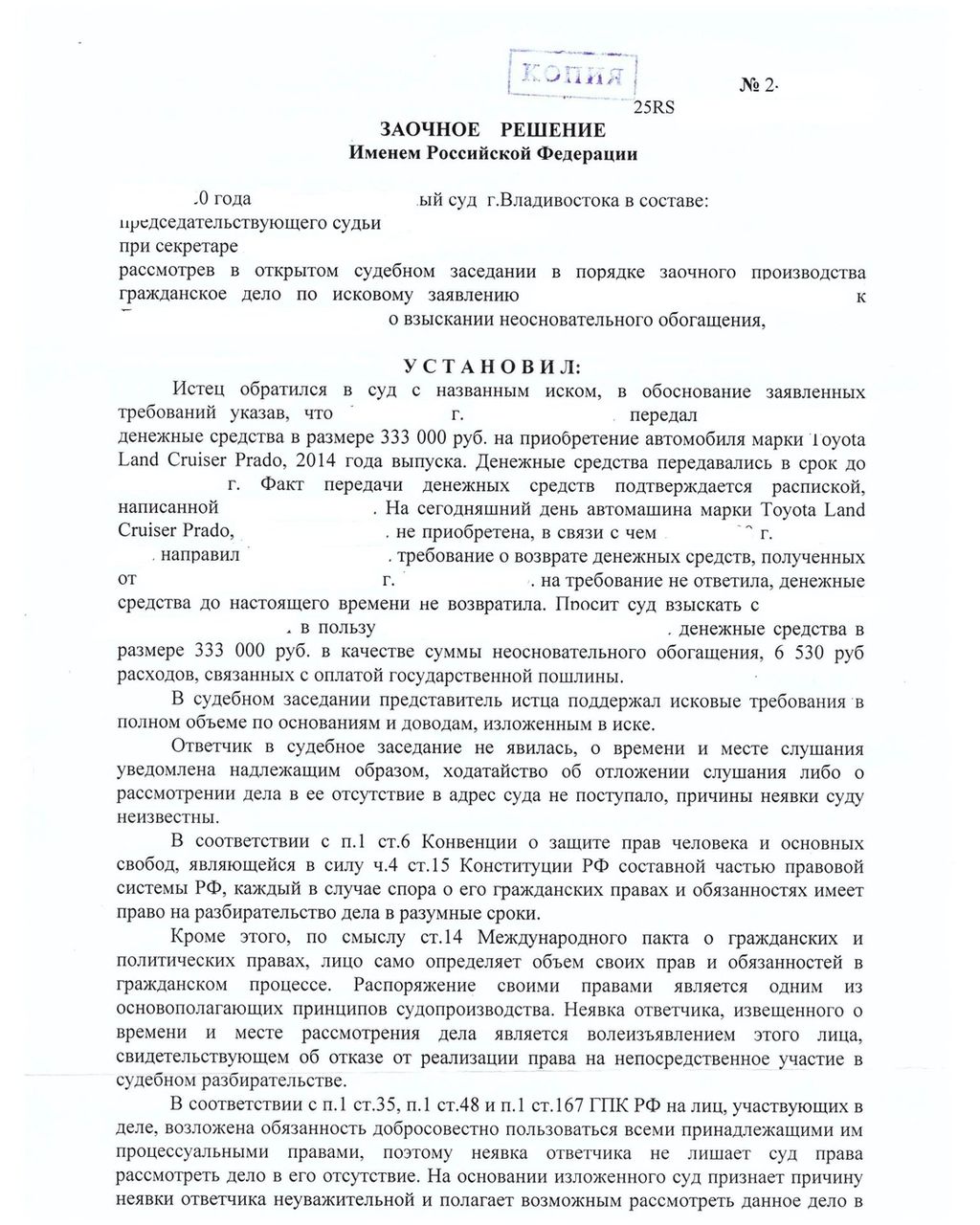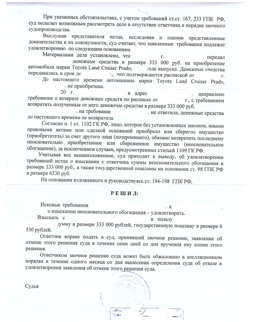 После обращения клиента нами был подан иск в суд о неосновательном обогащении, так как факт передачи денег был зафиксирован только распиской. Неосновательное обогащение — приобретение или сбережение имущества за счет другого лица без оснований установленных законом, иными правовыми актами или сделкой.