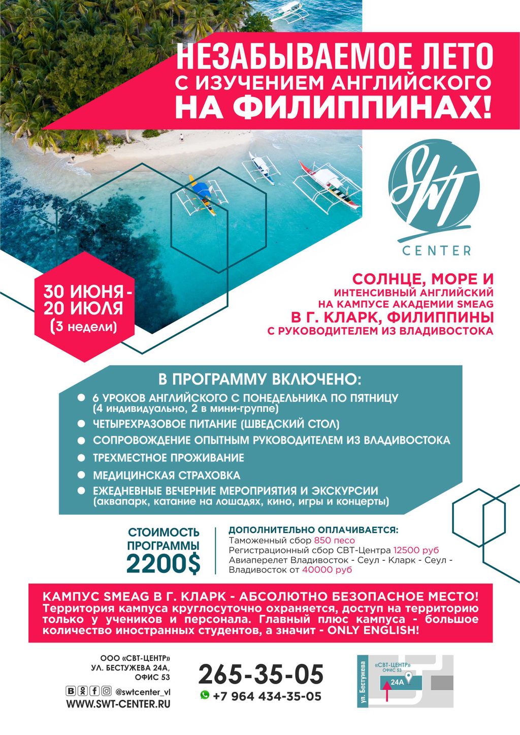 Для ребят 8-14 лет открывает свои двери международный лагерь на Филиппинах, расположенный на о. Кларк, провинция Тарлак. Кампус Академии английского языка SMEAG включает в себя все удобства, расположенные на огромной территории – новое общежитие с отдельными этажами для мальчиков и девочек, столовая с четырехразовым питанием по системе шведский стол, учебные классы, медицинская клиника, бассейн, баскетбольная площадка и территория для вечеринок!