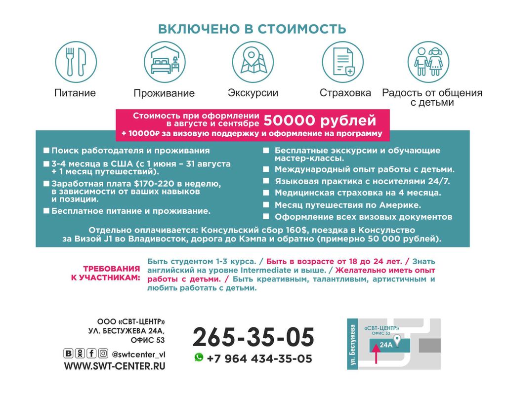 При оформлении в сентябре вас ждет приятный бонус: стоимость программы всего 50 000 рублей! Дополнительные платежи: регистрационный сбор СВТ-Центра 10 000 рублей, Консульский сбор за визу J1 $160, авиабилеты.