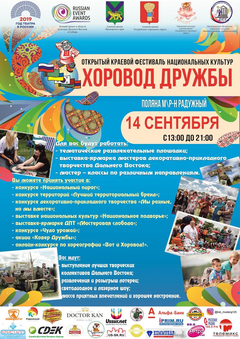 14 сентября 2019 года в 13:00 на живописной поляне, расположенной неподалеку от микрорайона Радужный пройдет Открытый краевой фестиваль национальных культур «Хоровод дружбы – 2019», организованный управлением культуры администрации УГО и МБУК ЦКС. На огромной открытой площадке более 1300 участников – коллективов, отдельных исполнителей, мастеров декоративно-прикладного творчества – встретят и радушно поприветствуют гостей Фестиваля.