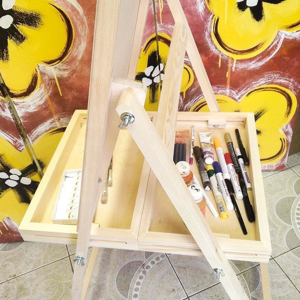 Для удобства художника имеется две полочки: малая и большая полка-ящик. Незаменимый элемент при использовании мольберта дома, когда у ребенка копятся различные краски, маркеры, мелки, карандаши и ластики.