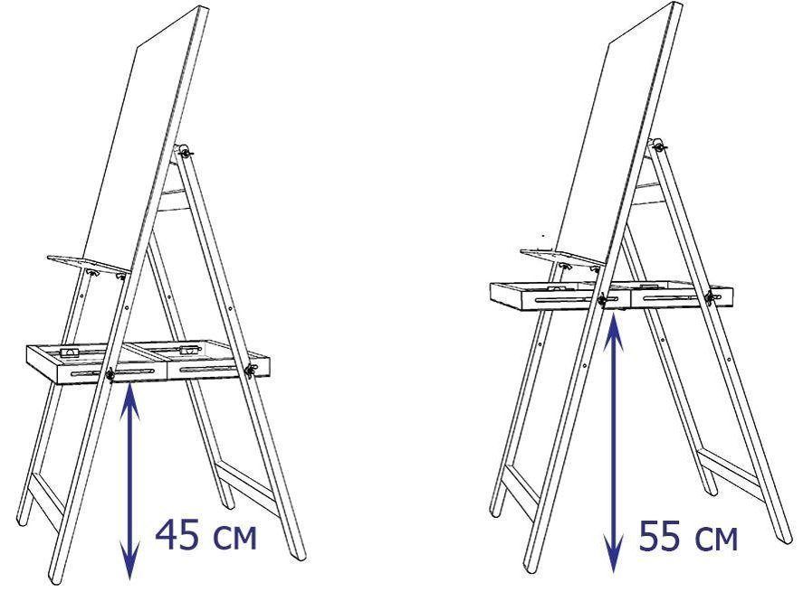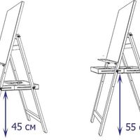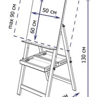 На мольберте предустановлен планшет размером 60х50 см. Он позволяет без использования дополнительных аксессуаров рисовать на бумаге до формата А2 (60х42 см) в вертикальном положении и до формата А3(42х30 см) в горизонтальном положении.