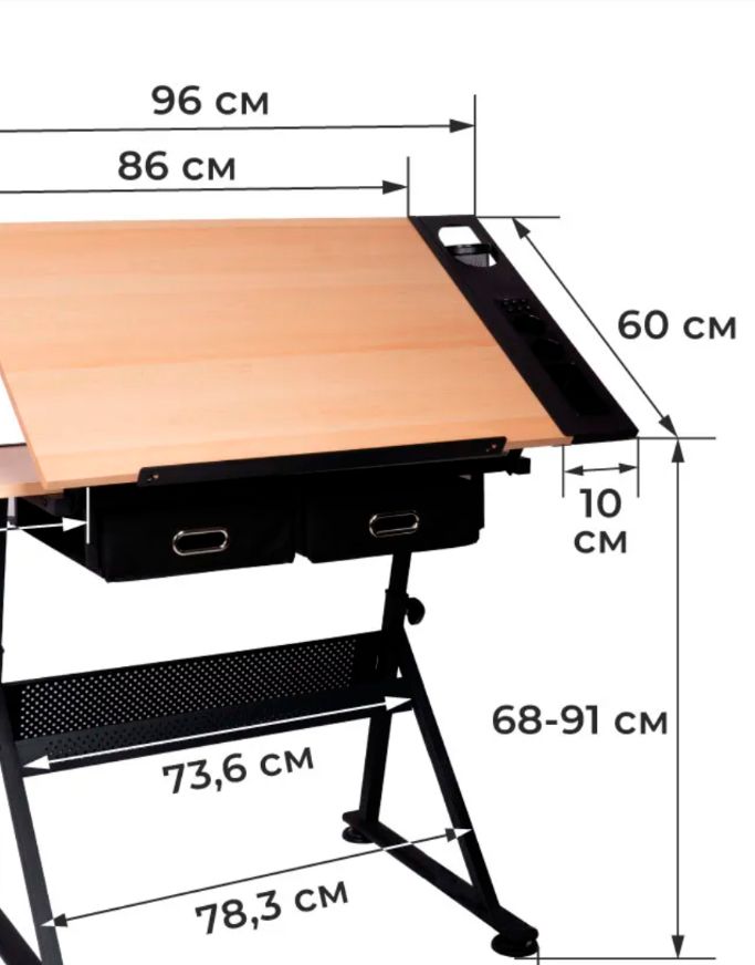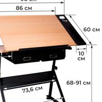 Основа стола — это металлический каркас, обеспечивающий высокую устойчивость конструкции. Столешница из МДФ имеет высокую прочность и устойчивость к повреждениям. Угол наклона столешницы регулируется от 0 до 60° и позволяет использовать стол как мольберт и не наклоняться вперед во время работы. Механизм настройки угла наклона установлен на тыльной стороне столешницы.
