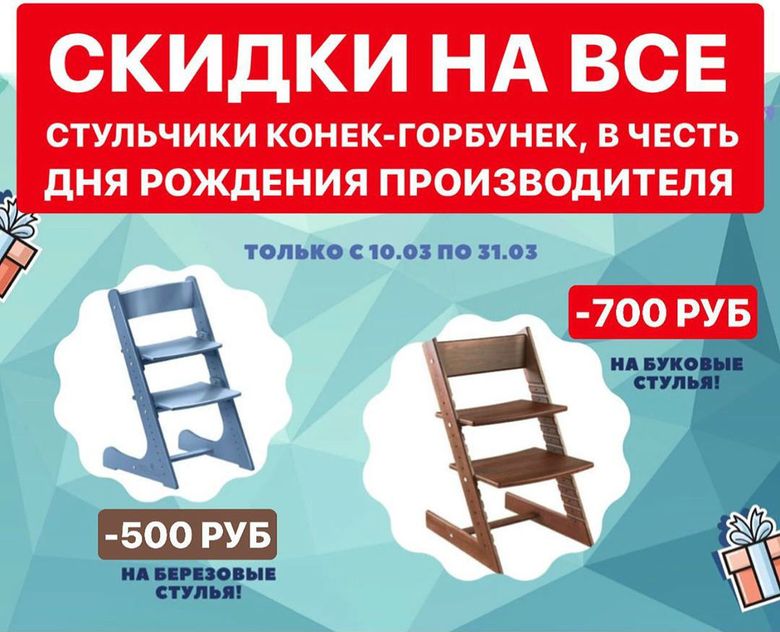 Магазин "VLADDETKI" предлагает скидки на ВСЕ растущие стульчики "Конек-Горбунек" в честь дня рождения производителя!