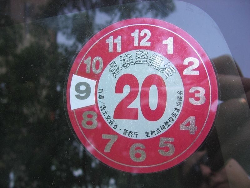 - Техобслуживание. В правом верхнем углу лобового стекла обычно присутствует круглая наклейка техобслуживания. Оно необязательно и заключается в том, что машину проверяет специалист на предмет пригодности к прохождению сякэна и проверяет уровни жидкостей, износ тормозных колодок и так далее.