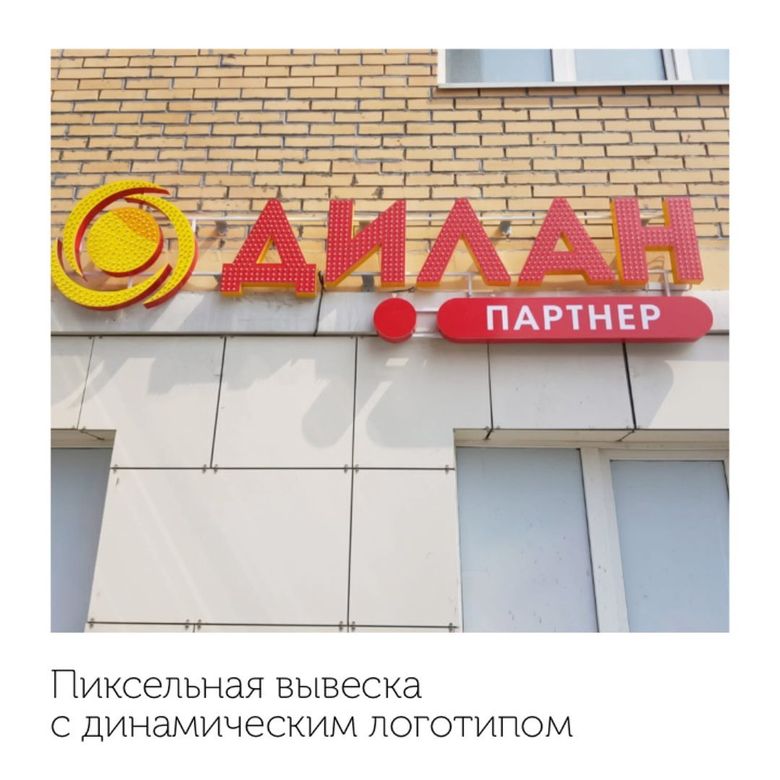 Динамическая пиксельная вывеска представляет собой конструкцию, полностью или частично состоящую из отдельных светящихся элементов. Она требует тщательной разработки и планирования. Для подсветки используются диоды.