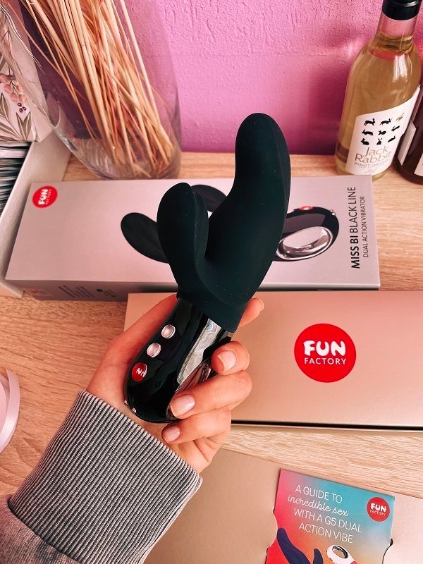 Это машина повышеннои? комфортности: два мощных моторчика в основном стволе и в отростке для клитора. Управляется Miss Bi тремя кнопками – кнопка Fun отвечает за включение и выключение, еще две кнопки регулируют вибрацию клиторального и вагинального моторчиков. Есть кнопка блокировки игрушки, с которои? я всегда борюсь. Нет, чтоб прочитать инструкцию. Я же тыкаю и зажимаю все кнопки. Иногда кажется, что я такими комбинациями что-то взорву :)