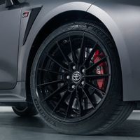Как и предполагалось, GR Corolla получила выпускную магистраль. Такая схема позволяет регулировать давление в системе и, следовательно, громкость выхлопа. Тормоза с четырехпоршневыми суппортами спереди и двухпоршневыми сзади, а также 18-дюймовые колеса.