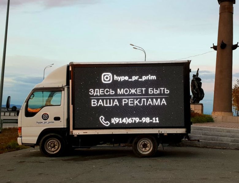 Рекламная компания "HYPE PR PRIM" принимает заказы на видеорекламу! Рекламные ролики показываются на большом и ярком LED-экране, установленном на авто.