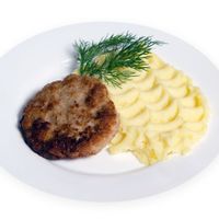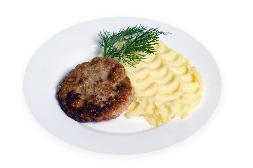 - Котлета мясная с картофельным пюре — свинина, говядина, лук репчатый, специи, картофель, масло сливочное, молоко.