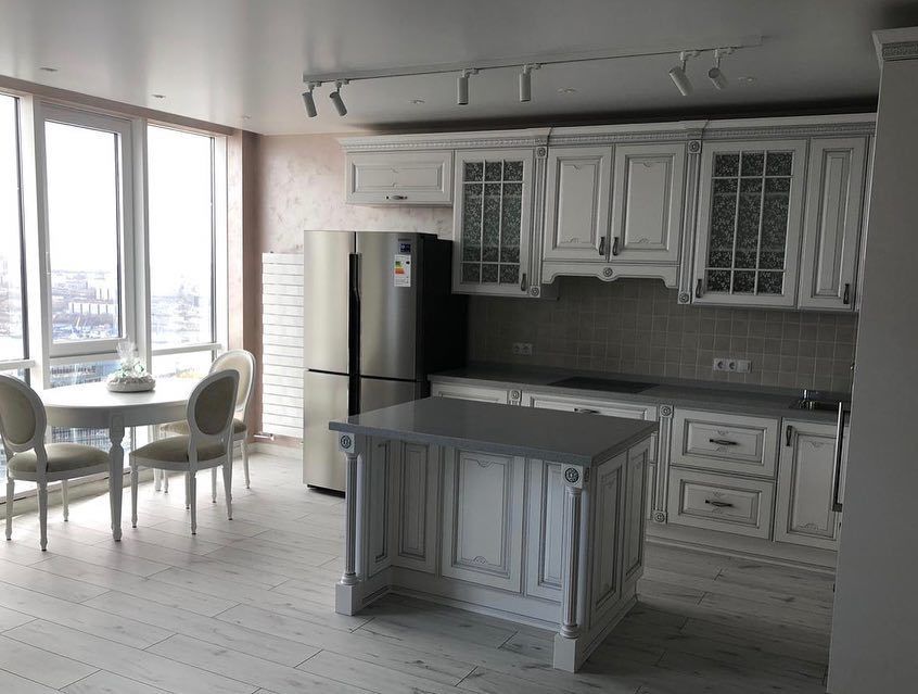 Кухня «Афина Аргенто» - это гармоничное сочетание чистого белого цвета с легкой серебряной патиной и резным узором. Рамка фасада выполнена из массива ясеня, а центральная часть из МДФ и облицована шпоном ясеня.