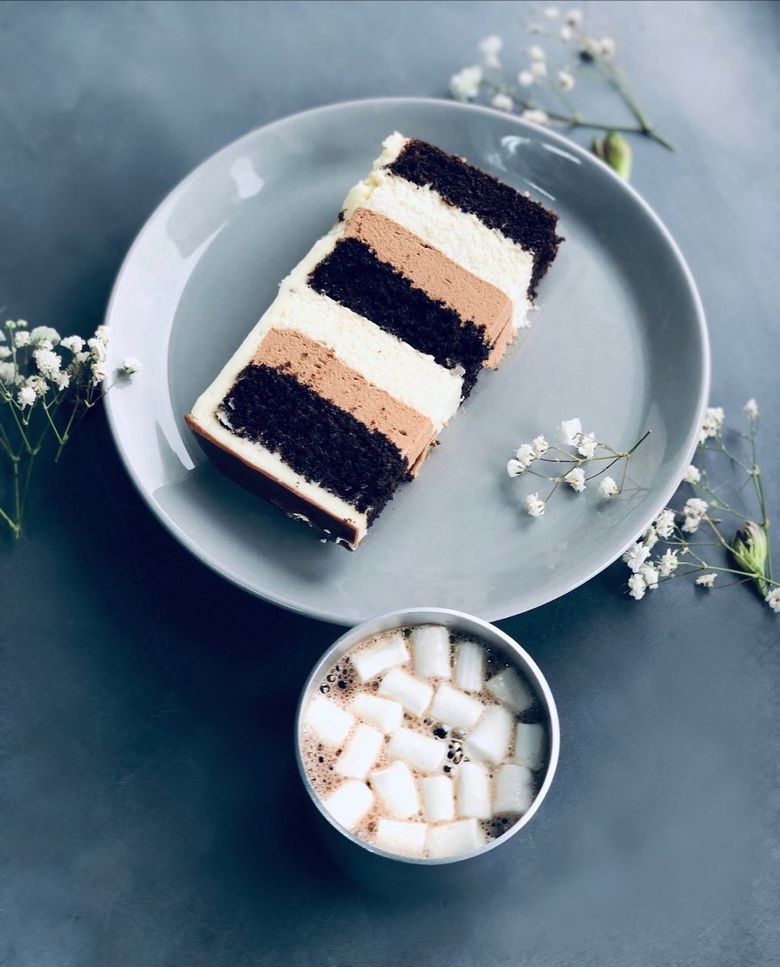 У "Молочного ломтика" очень красивый разрез: слой шоколадного бисквита, слой ванильного мусса, по вкусу напоминающего мороженое, и шоколадный мусс на основе бельгийского шоколада в сочетании с греческим йогуртом.