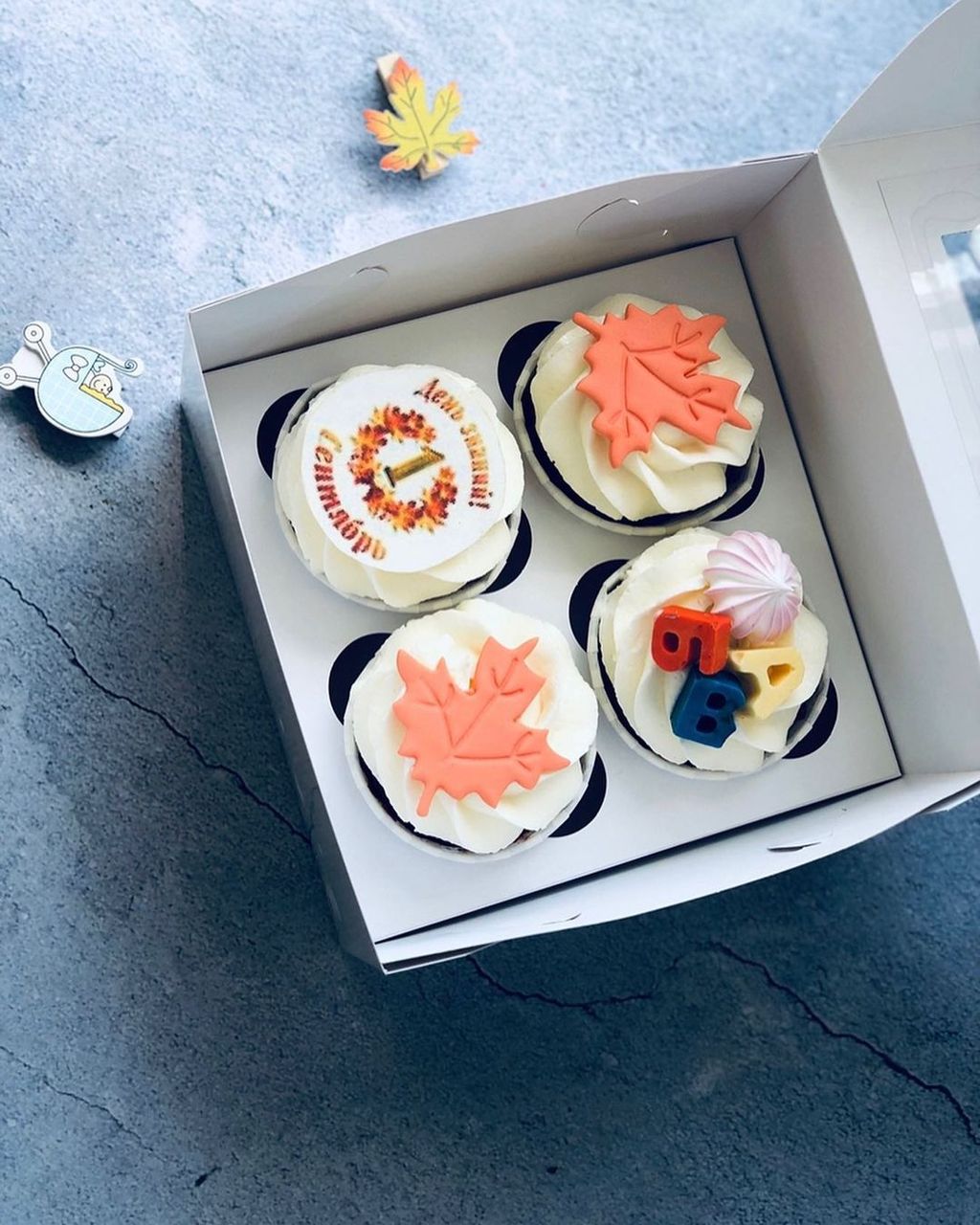 - Классические капкейки. Подарок для учителя вместо тысячи цветов - коробочка на четыре или на шесть вкусняшек. Стоимость 800 и 1200 рублей соответственно.