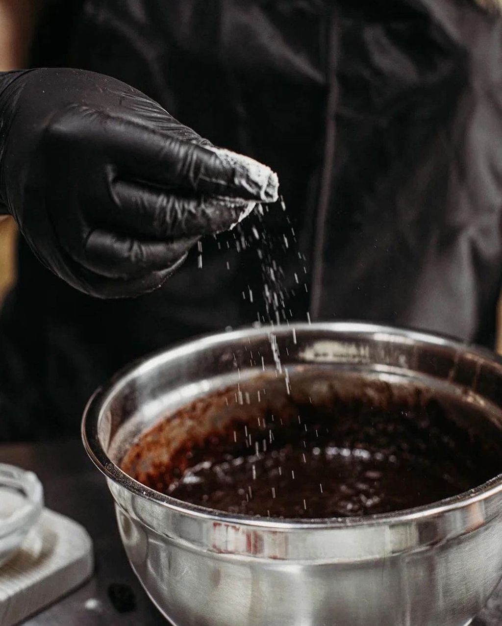Затем добавляем треть сыпучих ингредиентов и выливаем оставшуюся половину молока. Заканчиваем снова сыпучими ингредиентами.