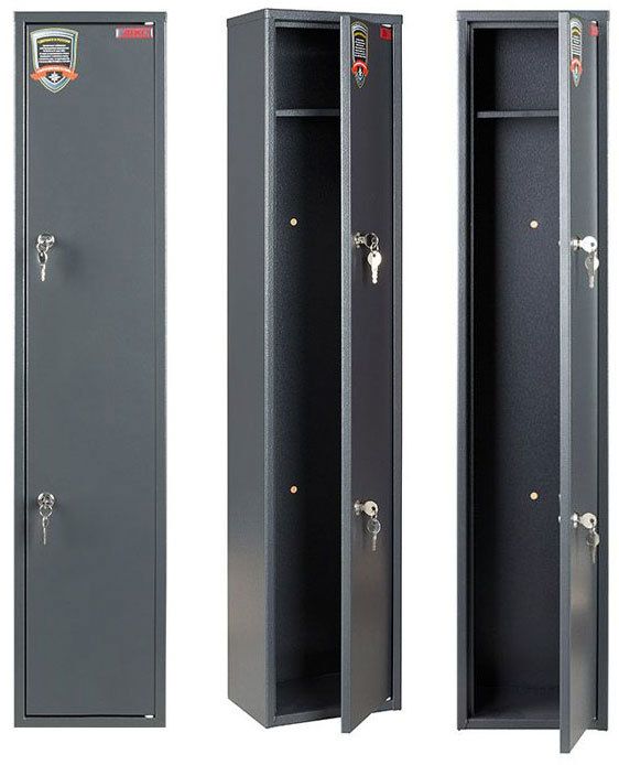 Отвечает требованиям МВД РФ к хранению огнестрельного оружия и боеприпасов: корпус изготовлен из стальных листов толщиной 1,5 мм, имеются два ключевых замка высокого качества.