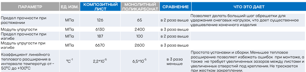 Композитный лист в два раза прочнее поликарбоната, а модуль упругости у композитного материала в три раза выше. Эти характеристики позволяют при устройстве крыше увеличить шаг обрешетки для удержания снеговых нагрузок, что дает существенное удешевление конструкции.