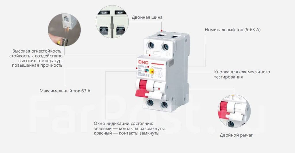 Устройство динамически контролирует параметры цепи. Полюс N может быть отдельно подключен или отключен, при этом он изолирован. Устройство выдерживает импульсное напряжение между L и N до 6000В. Импульсное напряжение между полюсом L и полюсом N может достигать 8000В. Выключатель выдерживает кратковременное воздействие токов до 200А.