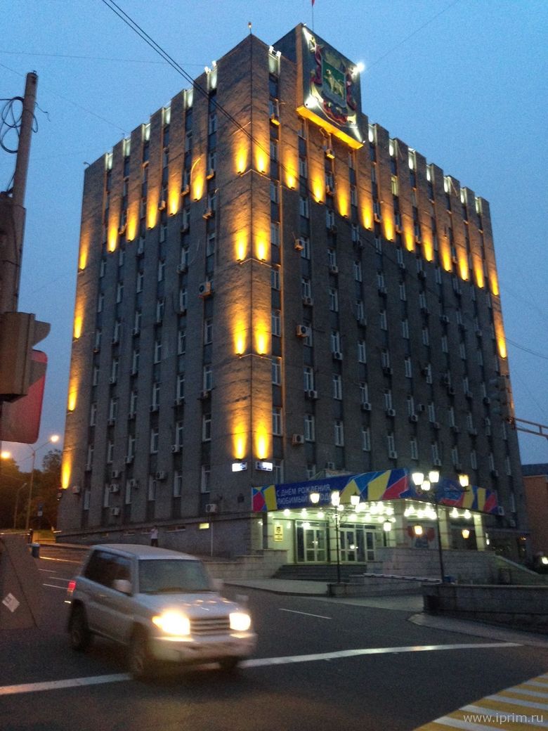 Так же была произведена работа по подсветке здания Администрации г. Владивостока. Профессиональная работа команды альпинистов обеспечила в кратчайшие сроки архитектурную подсветку узко и широко направленными прожекторами здания высотой порядка 35 м.