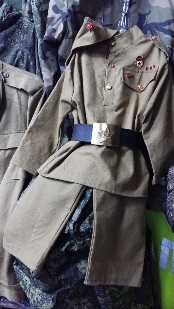 Если к параду Победы, что пройдет 9 мая, или для участия в школьном спектакле о войне вы ищете для своего сына или дочки подходящий костюм - приходите. В наличии размеры от 32 по 42. Все детали наряда надежно закреплены, поэтому форма совершенно безопасна даже для маленьких детей.