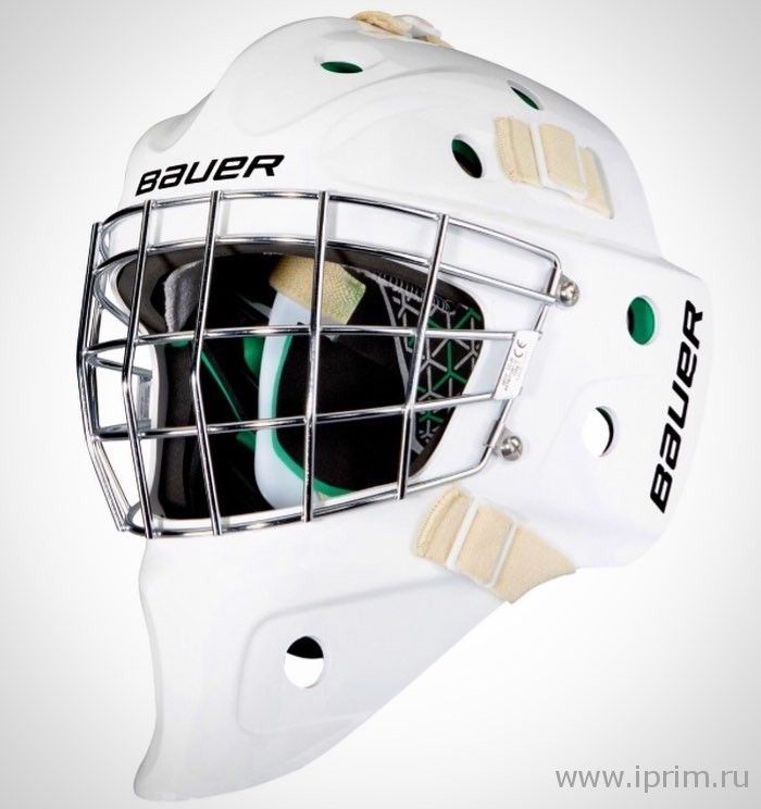 Затылочная часть шлема фиксируется с помощью эластичных ремней в пяти точках. На шлеме установлена маска, выполненная из прочной, углеродистой стали. Прутья маски имеют круглое сечение и расположены так, что не ограничивают обзор происходящего на льду. Модель Junior (юношеская).
