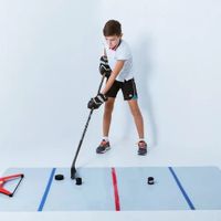 Для того, чтобы научится играть в хоккей на высоком уровне, необходимо не только знать о тактике, но и уметь выполнять обманные движение и маневры. Дриблинг – это техника контроля и ведения шайбы. Тренажер для дриблинга помогает отрабатывать технику владения клюшкой, обводку и пасы во время катания, а также тренирует движения кистью. Тренажер представляет собой скользящую поверхность – синтетический лед, к которому крепится специальная металлическая конструкция.