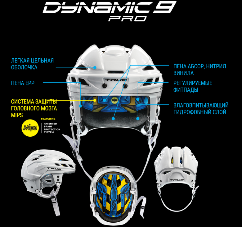Ультра облегченная конструкция шлема сделана цельной раковиной из полипропилена (EPP). True сделали DYNAMIC 9 PRO, чтобы он был самым легким шлемом в своем классе, не жертвуя ни одним из необходимых защитных элементов.