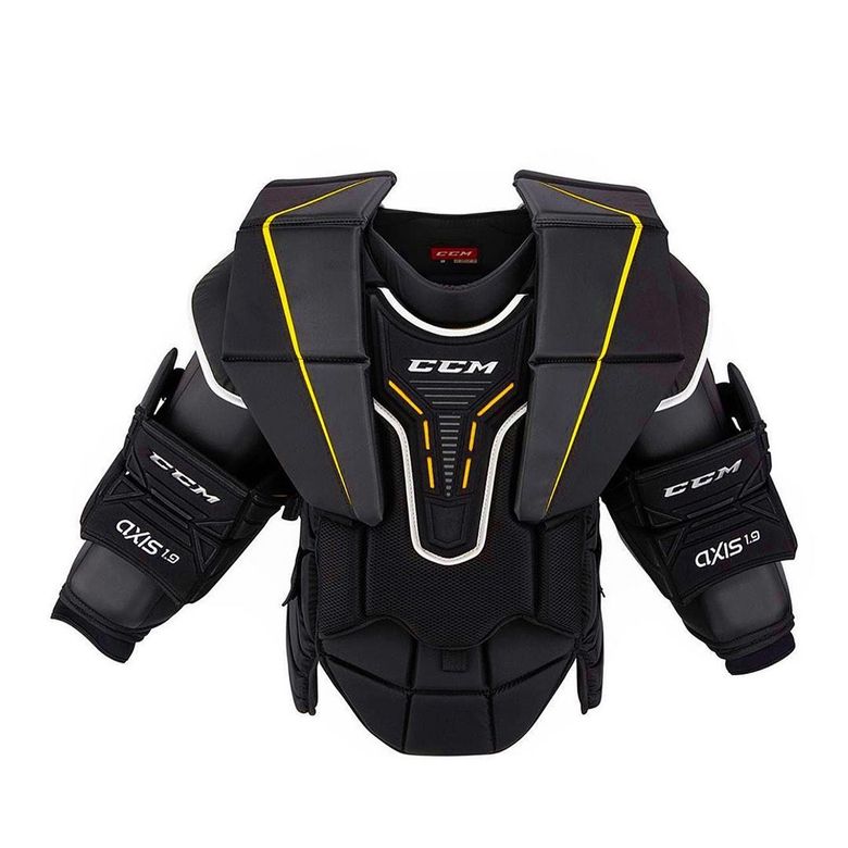 Напрмер, панцирь вратаря ССМ AB AXIS 1.9 ARM & BODY SR - материал наплечника выполнен из нейлона и высококачественной сетки, что гарантирует долговечность, комфорт и высокую воздухопроницаемость. Для большей защиты в области груди используется пена из формованного полиэтилена, а для защиты живота и ребер используется пена высокои? плотности.