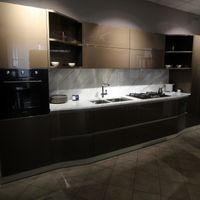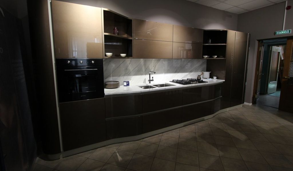 Фасад МДФ, пластик по бескромочной технологии, встроенный фасад ручка, столешница и стен. панель иск. камень Okite (пр-во Италия), подстветка в навесных шкафах. Возможна перепланировка