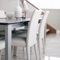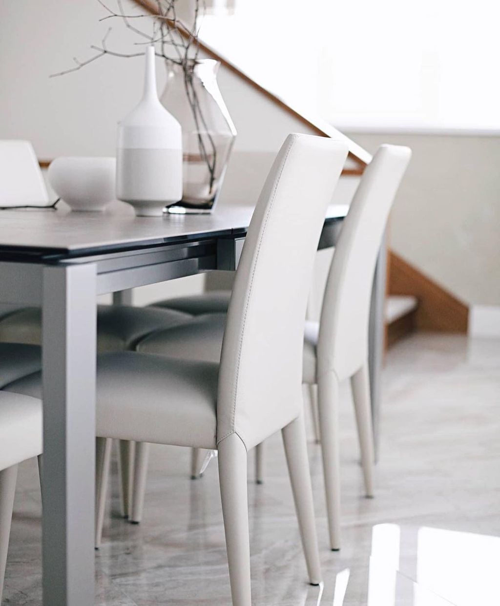 В интерьере использованы стулья "Anais" с обивкой из натуральной кожи, стол "Baron" с керамической столешницей, керамическая ваза с узким горлом, ваза стекленная и посуда из керамики @astradivari.