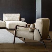 В основе кресла металлический каркас в дереве. Обивка на выбор покупателя - в коже или тканевая. Материал наполнителя - экологически чистый пенополиуретан с открытыми порами различной плотности, покрытый слоем tecnoform.