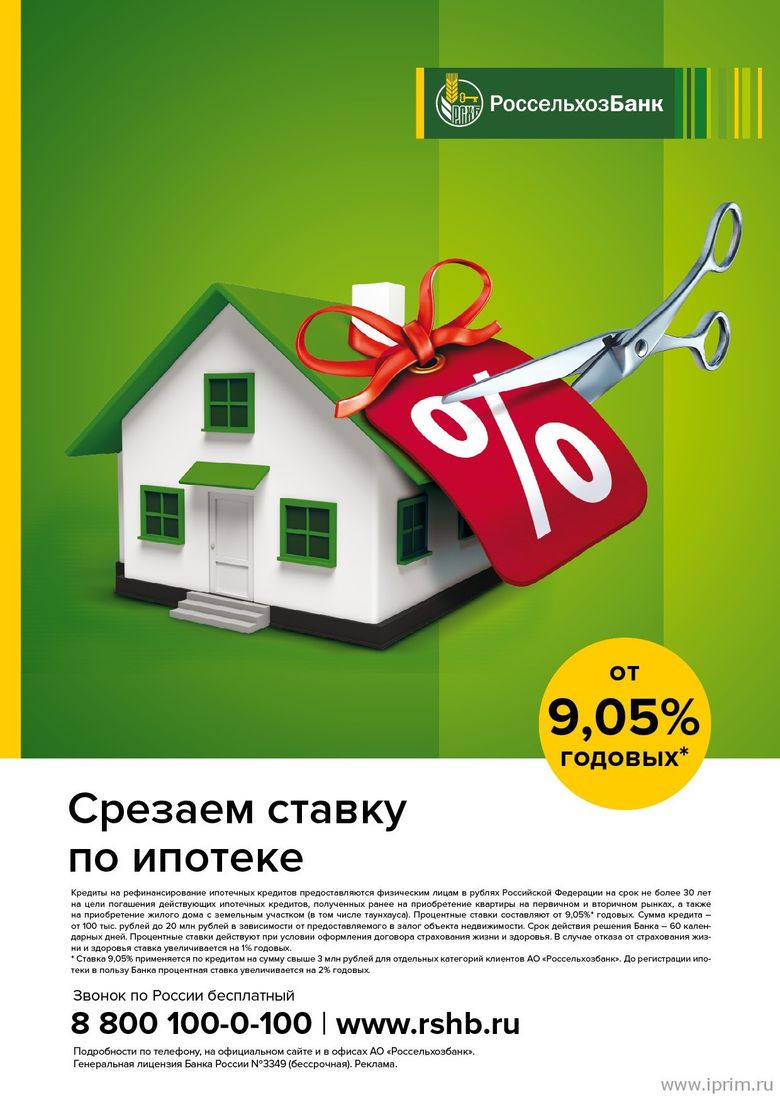 Для работников бюджетной сферы, зарплатных и «надежных» клиентов РСХБ процентная ставка от 9,05%, для остальных категорий клиентов – от 9,20%. Данное предложение о является одним из наиболее привлекательных предложений на банковском рынке. Россельхозбанк предоставляет кредит на сумму до 5 млн рублей на срок до 30 лет. Максимально возможная сумма кредита должна соответствовать остатку задолженности по ранее полученному ипотечному кредиту.