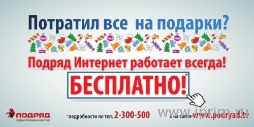 Самая главная новость - «Подряд» продолжает давать своим абонентам бесплатный Интернет. И даже при «нуле» и «минусе» можно пользоваться услугой Интернет и получать ее бесплатно. Соединение доступно на скорости до 128 кб/с. На этой скорости можно комфортно общаться в социальных сетях, просматривать почту, читать новости и оплачивать услуги online. Опция совершенно бесплатна и действует неограниченное время. Подключение на нее происходит автоматически при достижении нулевого или отрицательного баланса.