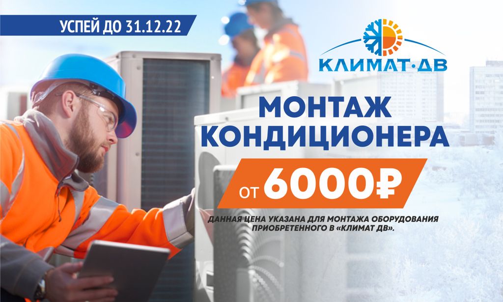 Начните заботиться о своем здоровье, а также здоровье своих близких прямо сейчас: изучите наш каталог, посоветуйтесь с нашими консультантами и сделайте выбор в пользу лучших кондиционеров! В преддверии Нового года компания "Климат ДВ" объявляет акцию - успей выбрать и заказать установку кондиционера до 31 декабря 2023 года и получи монтаж стоимостью от 6 000 рублей! Данная цена указана для монтажа оборудования, приобретенного в нашей компании.
