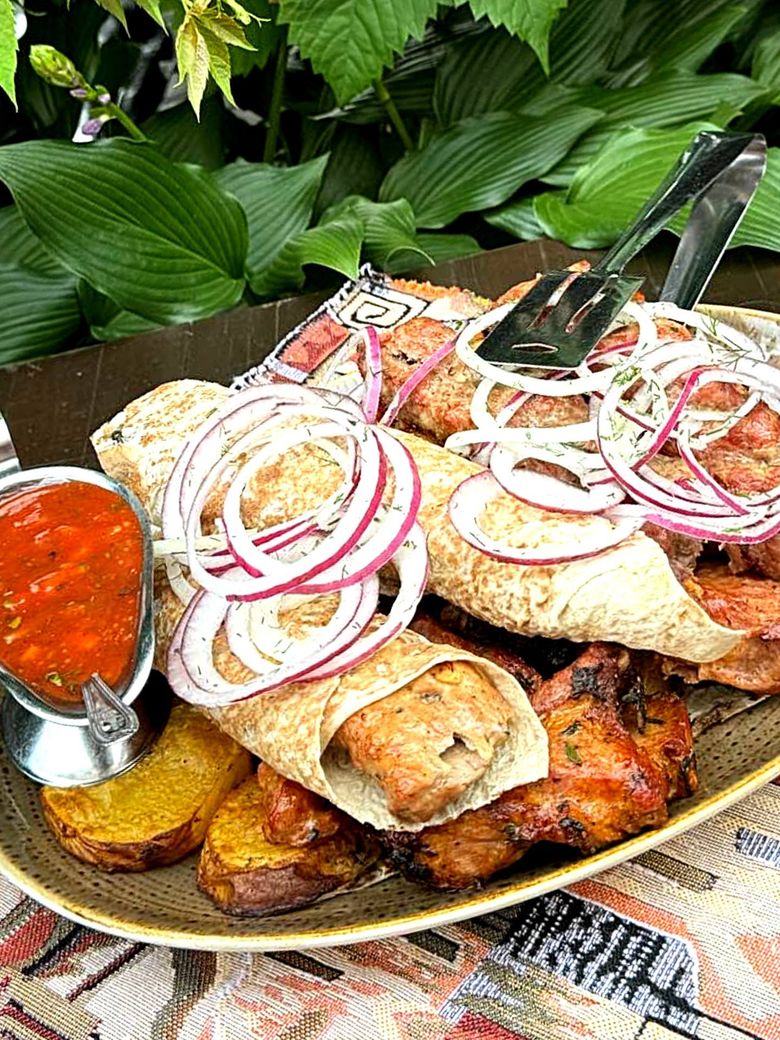 И 4 вида кебаба: говядина, курица, фирменный "Севан", баранина. На гарнир — вкусная печеная картошка.