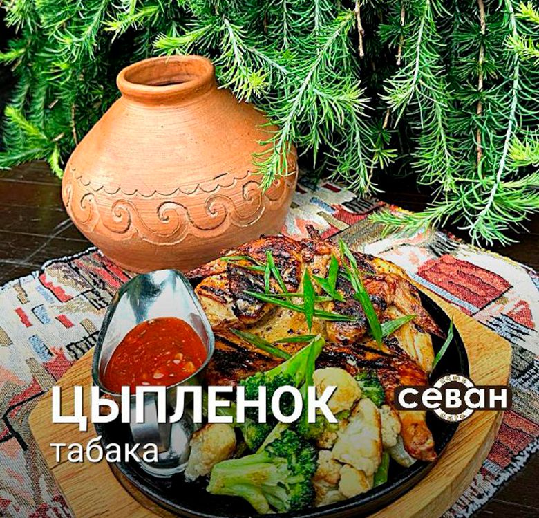 Цыпленок табака — одно из популярных блюд в кафе "Севан"! Сочное мясо цыпленка с хрустящей корочкой, обжаренное до золотистой корочки, подача с нежной цветной капустой и брокколи, добавляющими свежесть и легкость. Блюдо отражает традиции кавказской кухни и атмосферу внимательного подхода к сервировке и вкусу.
