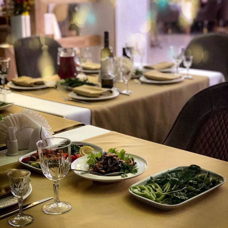 Меню включает в себя европейскую, кавказскую и авторскую кухню.Фирменные блюда из мяса ягнёнка или утки подарят необычные вкусовые ощущения даже гурманам. Большое количество салатов с крабом, креветкой, гребешком, сёмгой, кальмаром, а также морепродукты на гриле и чугуне станут украшением праздничного стола. Есть возможность разнообразить меню лёгкими фуршетными закусками: салатами в тарталетках, мини-шашлыками и люля-кебабами. Популярные европейские сладости подойдут абсолютно любому гостю. При заказе от 1700 рублей на одного человека есть возможность употреблять свои алкогольные напитки по договоренности с администрацией ресторана.