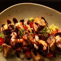 - Хрустящий баклажан с ростбифом, тигровой креветкой и кисло-сладким соусом — яркое сочетание. Сытно, эстетично и празднично.