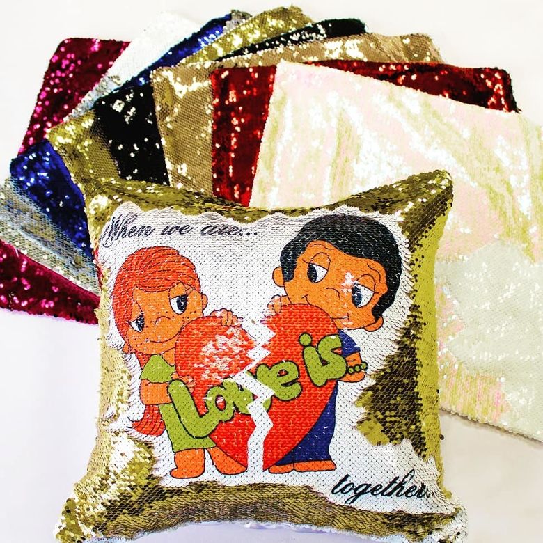 Подушка ХАМЕЛЕОН подстроится под любой интерьер, не надоест однообразием, предоставит простор для творчества. Материал съемной наволочки расшит специальными двусторонними пайетками. Проведите по ним рукой, и появится фото, картинка или надпись, которую мы напечатаем.