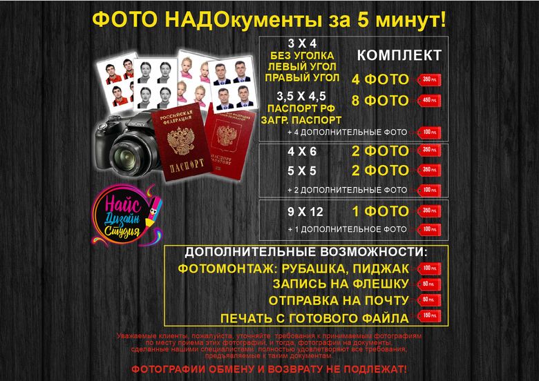 Услуга, которая никогда не потеряет актуальность - срочное фото на документы! "Дизайн Студия Найс" сделает отличный снимок необходимого формата всего за 5 минут. Наличие современной фототехники и внимание к пожеланиям клиента позволяют сделать удачным даже фото на паспорт гражданина РФ или заграничный. Помимо этого мы работаем со следующими форматами: