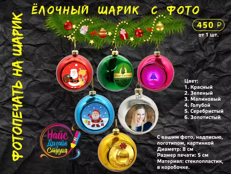 Для украшения елки предлагаем заказать печать любого изображения, фото или логотипа компании на елочных шарах диаметром 8 см из стеклопластика красного, голубого, малинового, зеленого, серебристого или золотистого цвета.