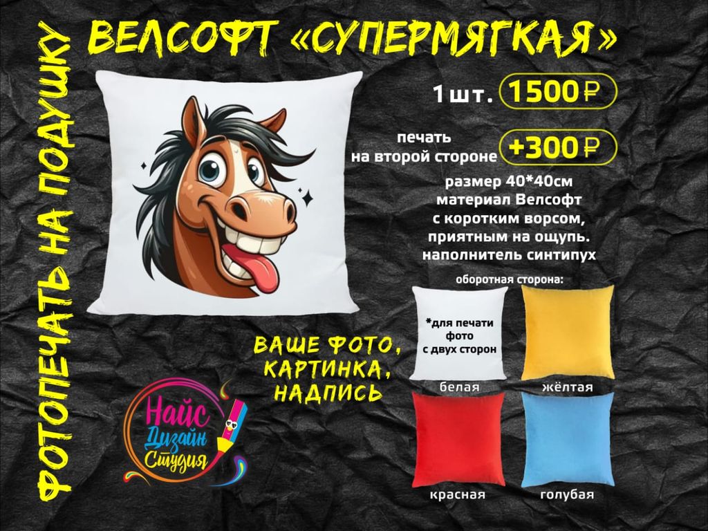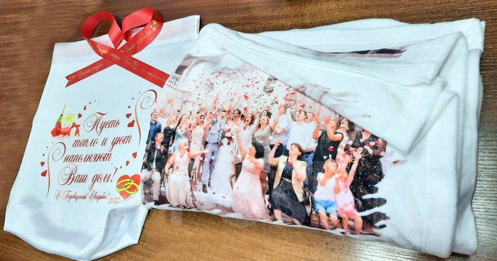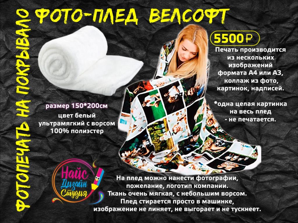 В "Дизайн Студии Найс" используются пледы для печати из белого полиэстера, ультрамягкий с ворсом (не флис), на которые наносятся изображения в виде коллажа. Печать производится методом сублимации, так что краска не потускнеет при стирке. Можно выбрать фото до 40 штук — соберем их в коллаж для печати, добавим текст, пожелание, поздравление.