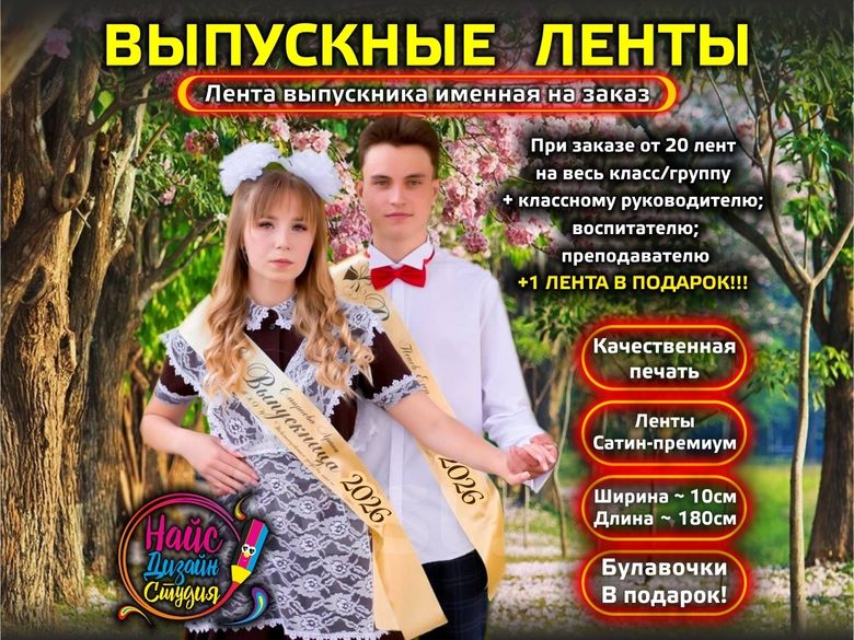 "Дизайн Студия Найс" предлагает услуги изготовления лент для выпускников с печатью. У нас вы найдете широкий выбор красивых дизайнов и действительно большую палитру цветов для лент из сатина класса "Премиум".