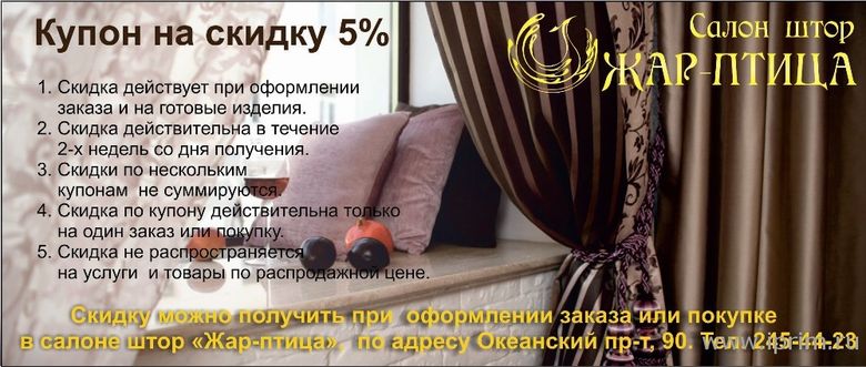 Скидку можно получить при оформлении заказа или покупке в салоне штор "Жар-птица", по адресу: Океанский пр-т, 90.