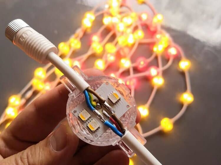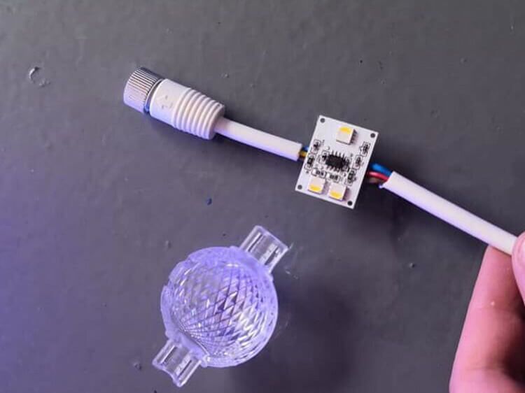 Первый нюанс - размер. Мы предлагаем покупателям 3D пиксели размером 4 см, что в два раза превышает размер существующих аналогов. Второй - совершенство технологии изготовления. Мы доработали ее и теперь в корпус заливается полиуретановый клей. Это повышает герметичность изделия, повышает стойкость электронных компонентов и контактных соединений с кабелем к механическим нагрузкам. Третий нюанс - расширение цветового диапазона через комплектацию светодиодами 4in1, RGBW или RGBAmber на выбор заказчика.